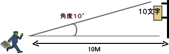 | 歩行者の目線を考えた時は、10m手前から認識でき角度は 同じく10度までにおさめます。 文字の大きさは、1文字、25p以上 |